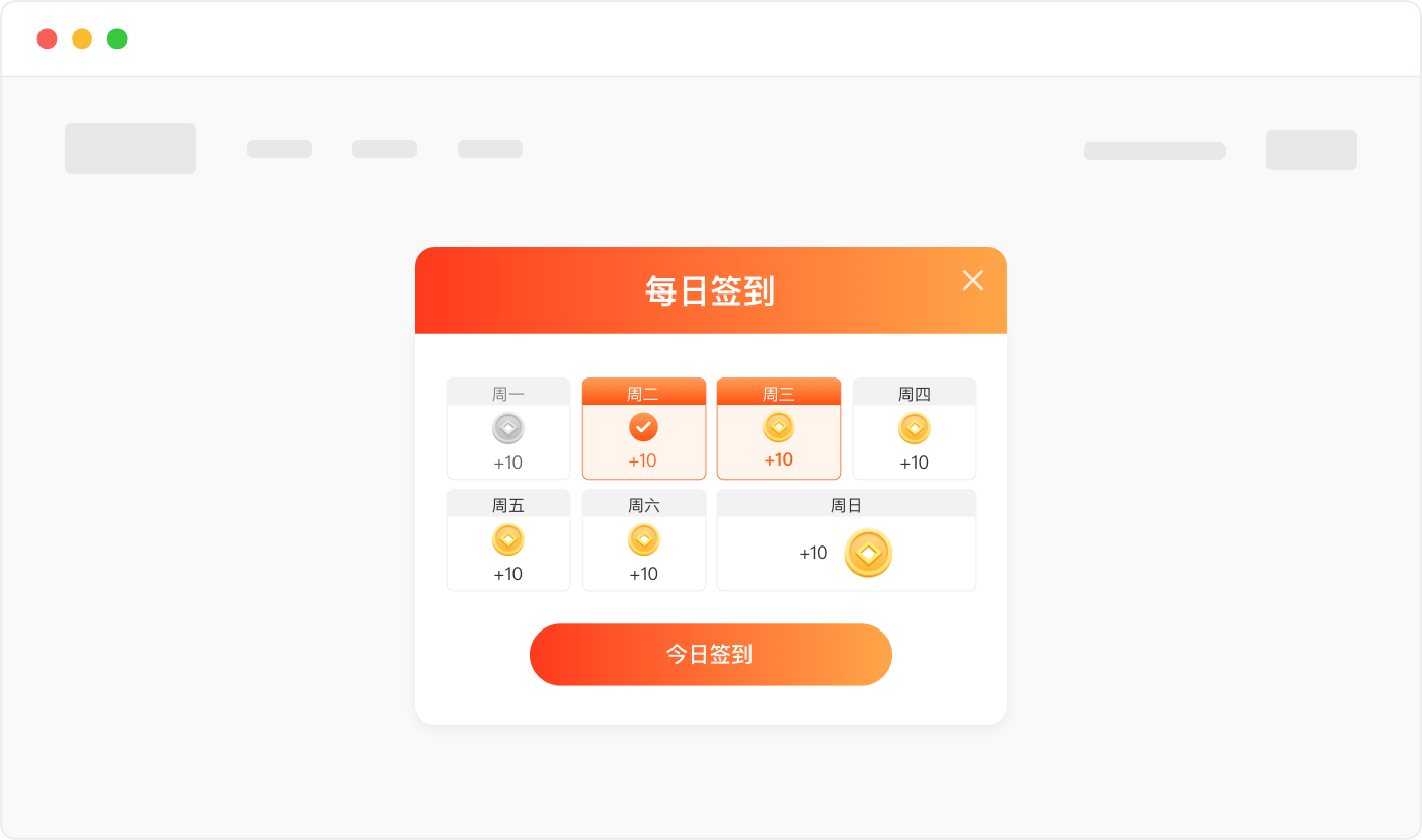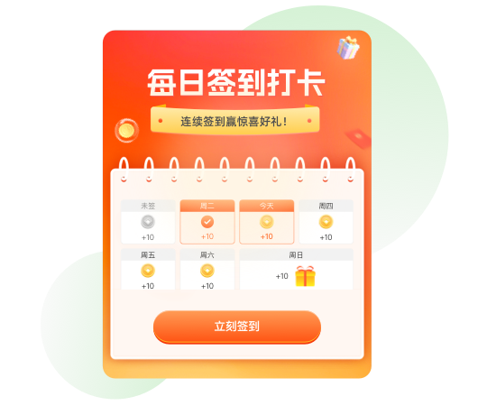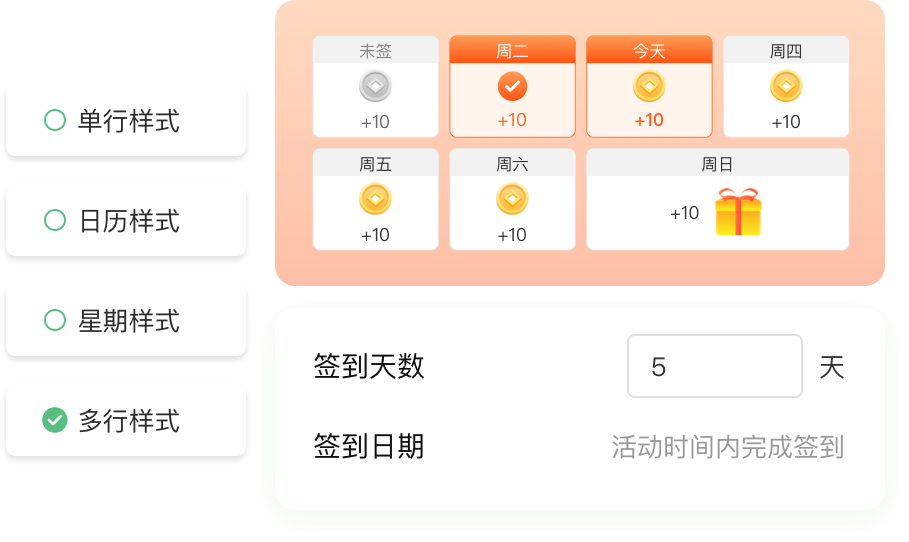 通过设置天数、星期、日历等方式自定义签到周期,每轮签到完成可获取奖励激励,同时支持分享补签玩法,增加裂变效果