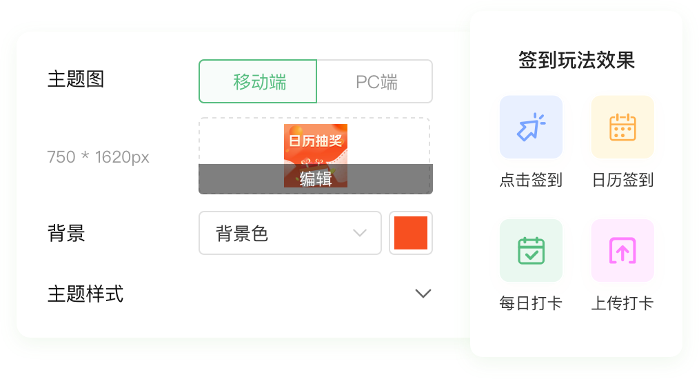 点击签到、日历签到、每日打卡、上传打卡等多种互动玩法,可自定义页面主题、颜色、图片来个性化您的活动,自定义显示奖品列表、中奖记录