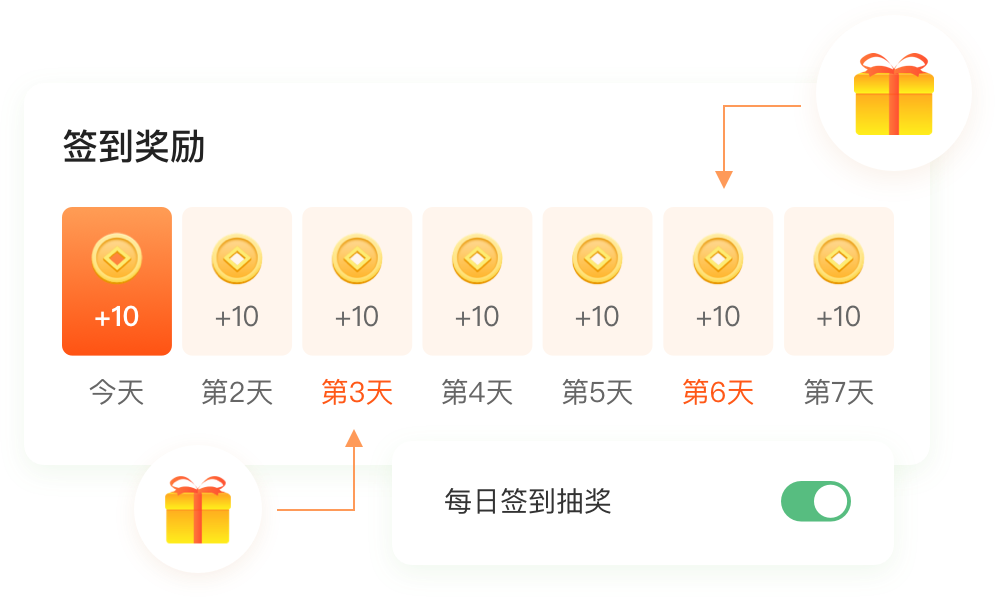 活动奖励,支持按天数设置,完成连续签到或累计签到获取奖励,同时支持每日签到抽奖,设置每日中奖数量限制可有效降低活动运营成本
